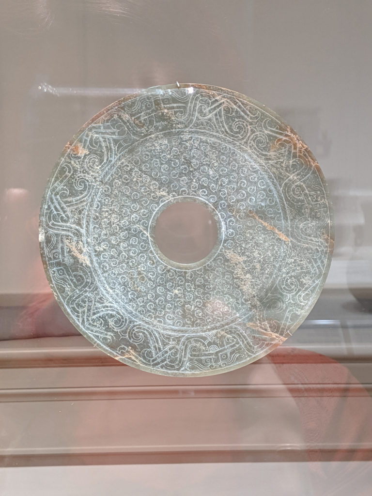 So, I just exercised my Google-fu, as I really didn’t know anything about Bi-discs, and now I know a lot more. Bi (or annulus – plural, annular) discs were neolithic ritual objects tied most closely to burials. Most were jade (aka, nephrite), but some were glass (depending on your status and how much you could afford to spend), and the amount of decoration and the ornateness of the decoration also corresponded to how much money had been spent on the object’s commission. Bi discs are thought to have to do with creation mythology and other god mythos, but seeing as how there isn’t a written record, we can’t tell for certain. And, there we go. That’s your knowledge dump for the day.