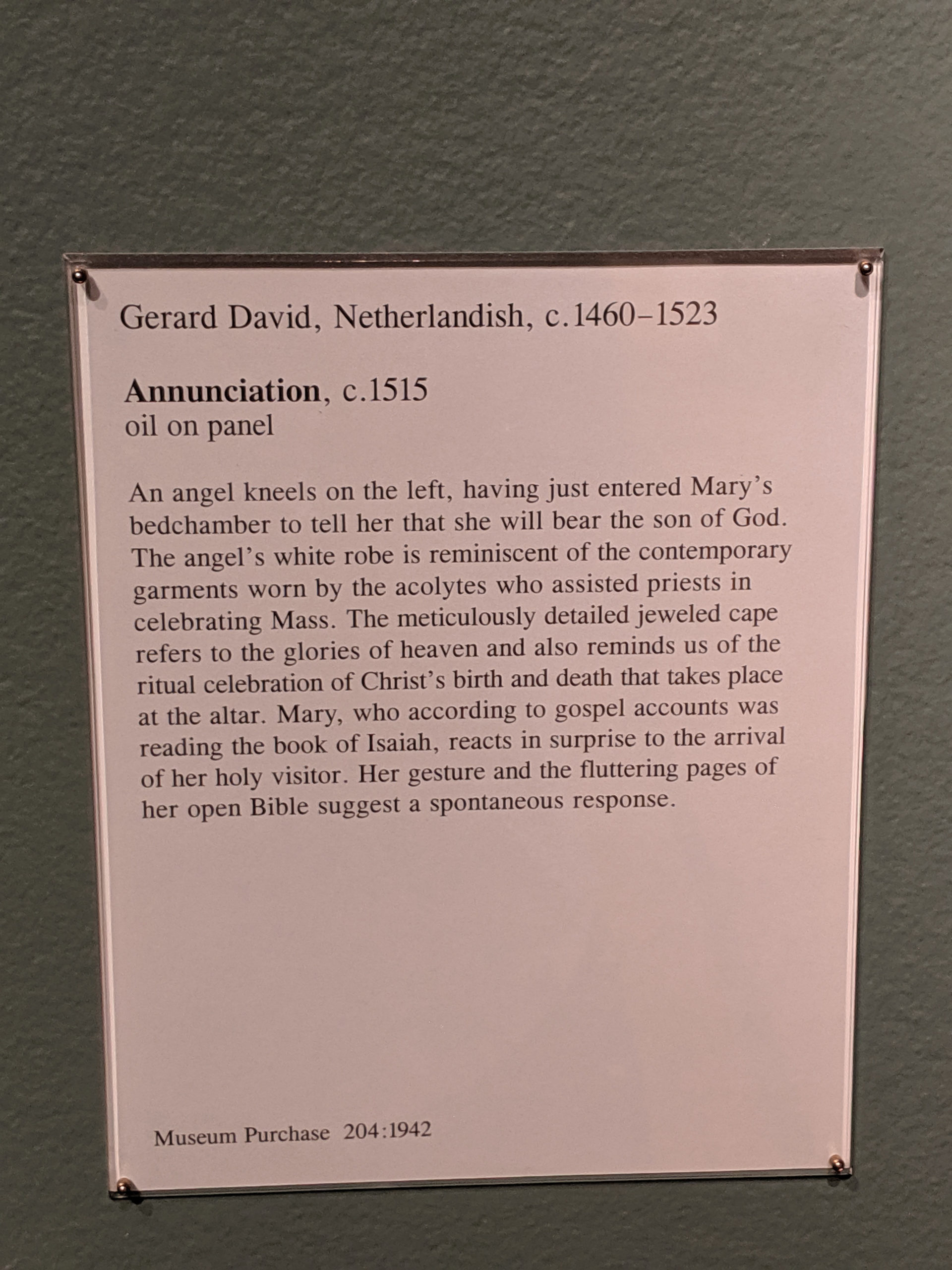 So… fun times. Religious art again. Because, ya know, Bible Belt and all. I am not a massive fan, but hey, it’s a huge part of our world heritage and so on and so forth. Whatever, it’s a thing. What bothers me about this is the descriptive plaque being completely ignorant about the fact that Mary would likely not have owned a Torah, and likely she would not have been reading even had she been a wealthy Jewish woman of the time, let alone marrying a carpenter – but yeah, let’s creatively fudge the facts to fit the Jesus mythos.